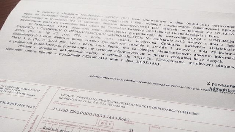 Jeden ze słuchaczy przyniósł do naszej redakcji list z Centralnej Ewidencji i Informacji o Działalnościach Gospodarczych i Firm, nawołujący go do zapłaty rejestracyjnej w wysokości 295 zł w terminie do 9 grudnia.