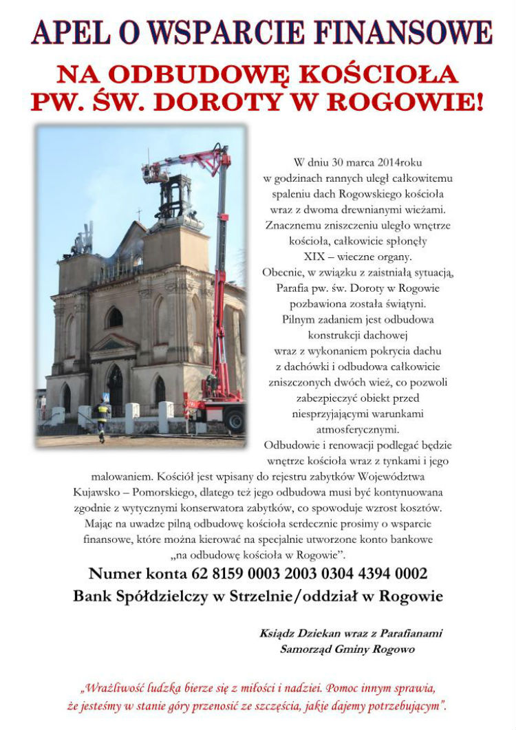 W minioną niedzielę, około godziny 5.00 rano, w Rogowie spłonął dach i dwie wieże kościoła pod wezwaniem św. Doroty. Straty są ogromne dlatego parafia prosi o wsparcie finansowe.