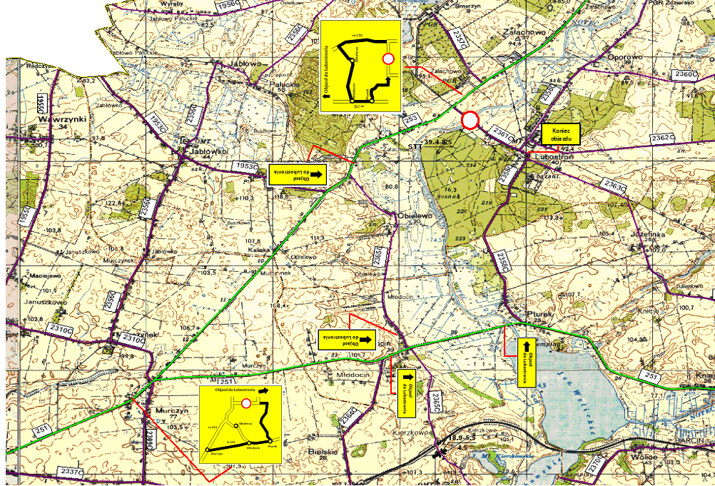 Pierwszy objazd rozpoczyna się na skrzyżowaniu z droga 253 z drogą nr 2361C w Załachowie i prowadzi przez Obielewo, Młodocin i Pturek. Drugi rozpoczyna się w Murczynie i prowadzi przez Murczym, Młodocin i Pturek.