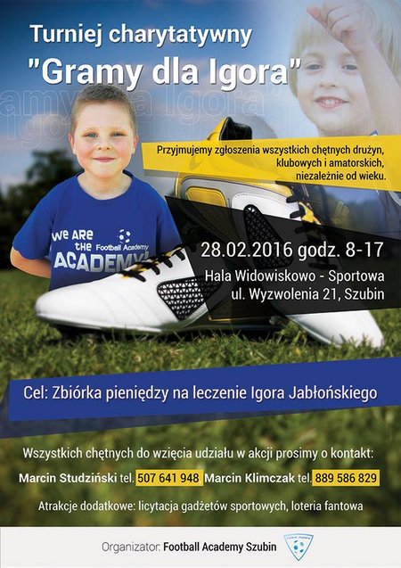 Turniej charytatywny gramy dla Igora odbędzie się w hali widowiskowo-sportowej przy ul. Wyzwolenia w Szubinie. Wszyscy chętni do wzięcia aktywnego udziału w akcji cały czas mogą dokonywać zgłoszeń. Kontakt z organizatorem znajdziecie poniżej na plakacie.