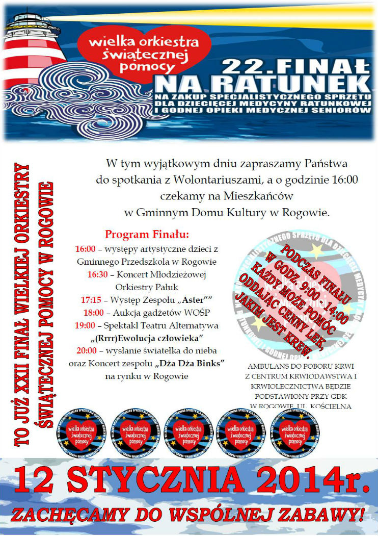 W tym wyjątkowym dniu zapraszamy Państwa do spotkania z Wolontariuszami, a o godzinie 16:00 czekamy na Mieszkańców w Gminnym Domu Kultury w Rogowie.