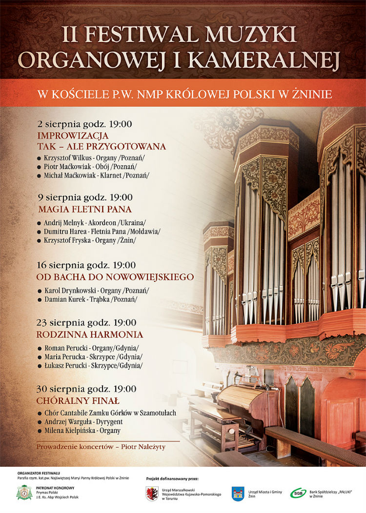 Parafia Najświętszej Maryi Panny Królowej Polski w Żninie, wzorem ubiegłego roku, organizuje Festiwal Muzyki Organowej i Kameralnej. Na ten cel udało się pozyskać dofinansowanie w ramach projektu 'Milion złotych na kulturę”. Parafia mariacka otrzymała 6 tysięcy złotych. Motywem wiodącym festiwalu będą organy, mówi proboszcz parafii, ksiądz Stanisław Talaczyński.
