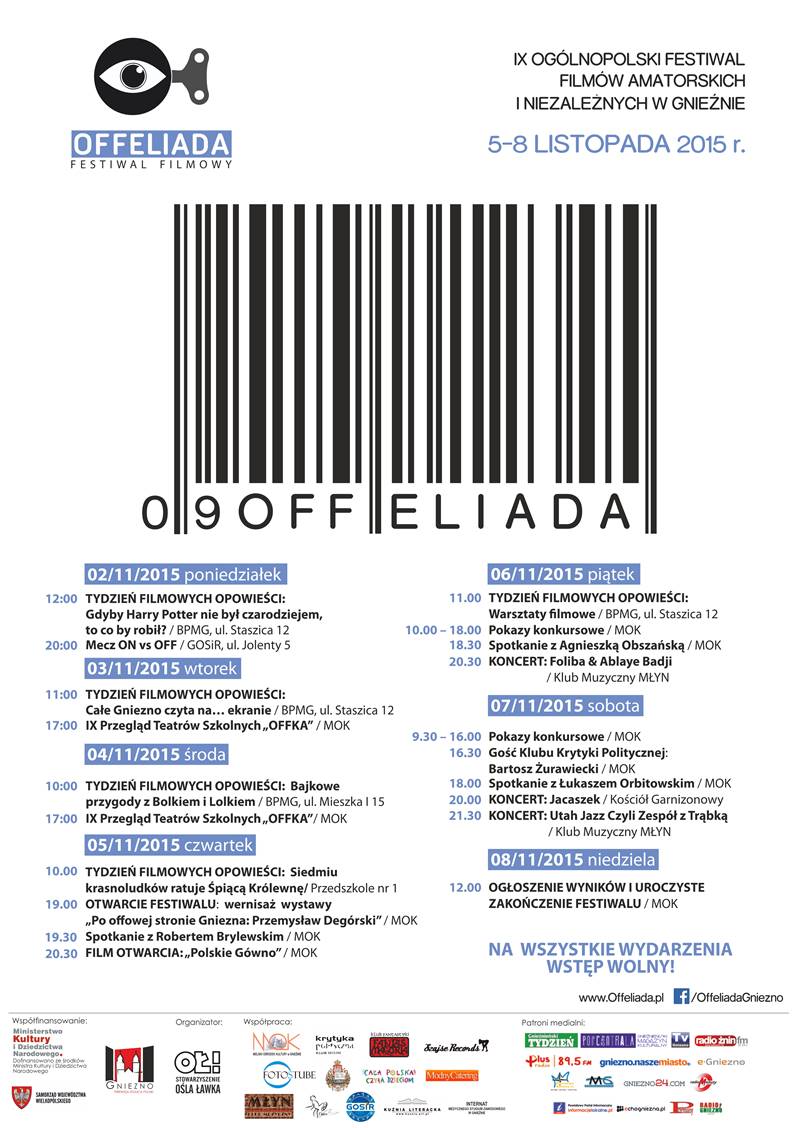 IX Offeliadaw Gnieźnie potrwa, łącznie z wszystkimi wydarzeniami towarzyszącymi, od 2 do 8 listopada 2015 roku. W jej bogatym programie oprócz pokazów konkursowych znalazły się koncerty, wystawy, spotkania z zaproszonymi Gośćmi oraz panele dyskusyjne. Szczegółowy program znajdą Państwo poniżej. A patronat medialny nad całym wydarzeniem sprawuje Radio Żnin FM.