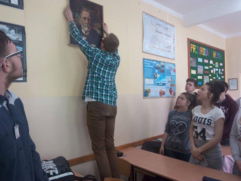 Podczas uroczystego przekazania młodzież z klasy 1b, która odbywała lekcję chemii miała też możliwość zapoznania się z twórczością Jerzego Marosza, o której opowiadał sam artysta.