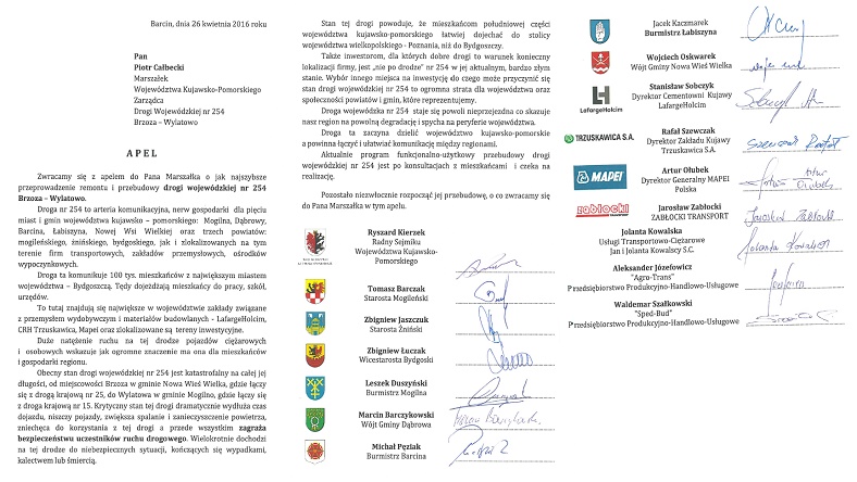 W miniony wtorek 26 kwietnia w sali sesyjnej Urzędu Miejskiego w Barcinie podpisano Apel samorządowców i przedsiębiorców do Marszałka Województwa Kujawsko-Pomorskiego Piotra Całbeckiego w sprawie przyspieszenia rozbudowy drogi wojewódzkiej nr 254 Brzoza – Wylatowo.