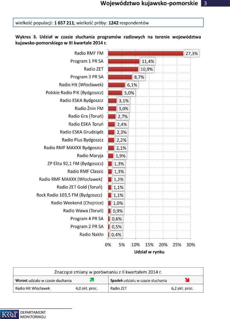 Krajowa Rada Radiofonii i Telewizji opublikowała właśnie raport kwartalny słuchalności stacji radiowych w województwie kujawsko- pomorskim. Radio Żnin FM w III kwartale tego roku znalazło się na 8 miejscu z wynikiem 3%. To najlepszy wynik w ponad trzyletniej histori rozgłośni. NWyprzedziliśmy stacje radiowe będące znacznie dłużej na rynku m.in.: Radio Gra, Złote Przeboje Elita, Program 4 Polskiego Radia czy Radio Maryja.