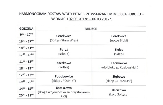 Harmonogram dostaw wody pitnej zamieszczony jest w specjalnej tabeli, którą można znaleźć poniżej.