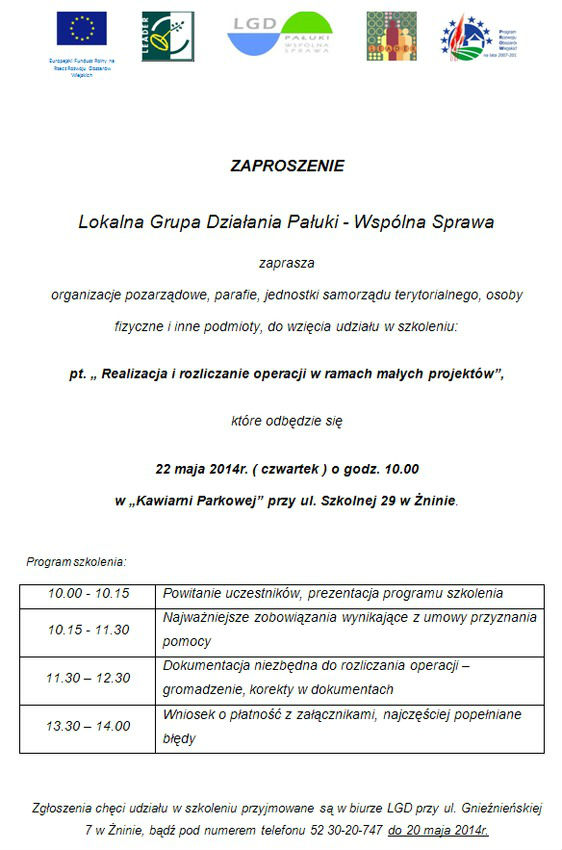 Lokalna Grupa Działania - Pałuki Wspólna Sprawa zaprasza przedstawicieli organizacji pozarządowych, parafii, jednostek samorządu terytorialnego oraz osoby fizyczne do wzięcia udziału w szkoleniu pod tytułem "Realizacja i rozliczanie operacji w ramach małych projektów".