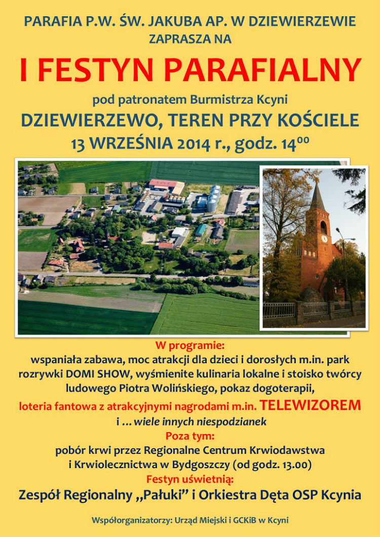Współorganizatorami I Festynu Parafialnego w Dziewierzewie sa Urząd Gminy Kcynia i Gminne Centrum Kultury i Biblioteki w Kcyni.