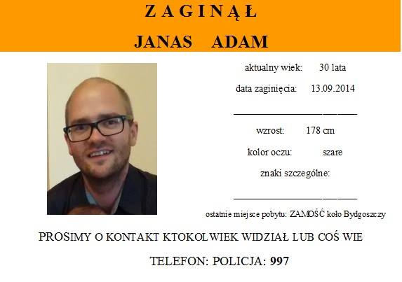Policja, rodzina i przyjaciele poszukują Adama Janasa. Mężczyzna zaginął w sobotę 13 września. Ostatni raz widziano go w Zamościu w gminie Szubin. Adam Janas ma 30 lat, szare oczy i 178 centymetrów wzrostu. Jeżeli ktoś widział mężczyznę od dnia jego zaginięcia lub wie cokolwiek na jego temat proszony jest o kontakt z policją pod numerem telefonu 997.