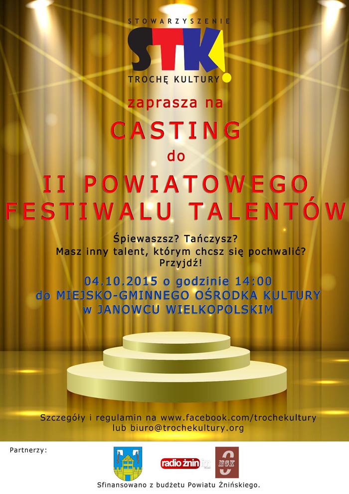 Stowarzyszenie Trochę Kultury! już po raz drugi zaprasza społeczność lokalną powiatu żnińskiego do udziału w Powiatowym Festiwalu Talentów.