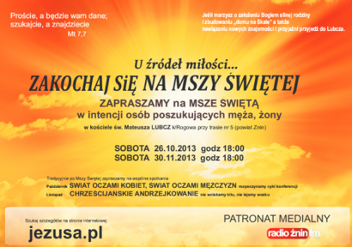 Jeśli marzysz o założeniu z Bogiem silnej rodziny i zbudowaniu „domu na Skale” a także nawiązaniu nowych znajomości i przyjaźni przyjedź do Lubcza na Mszę Świętą w intencji osób poszukujących drogi życiowej w małżeństwie, która odbędzie się 26 października i 30 listopada o godz. 18:00 . Po Mszy Świętej spotkanie przy kawie i poczęstunku.