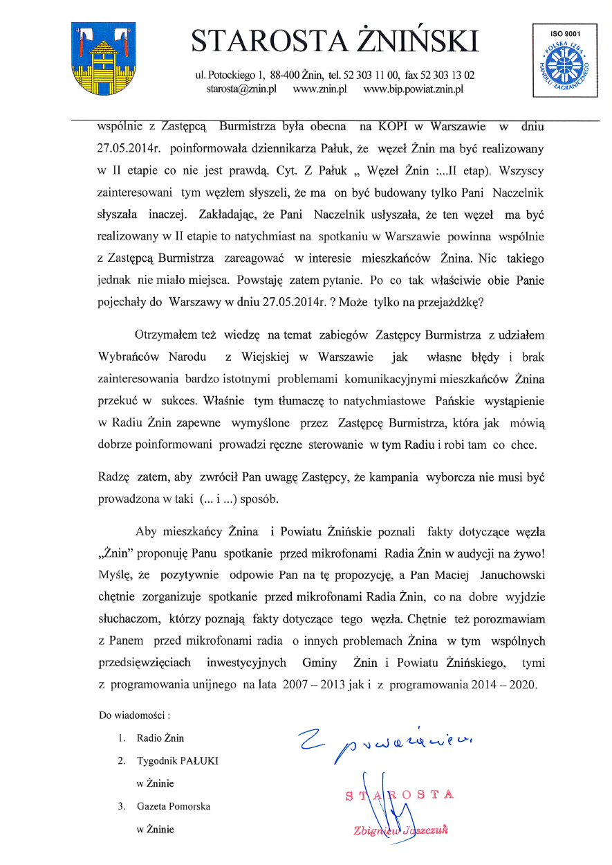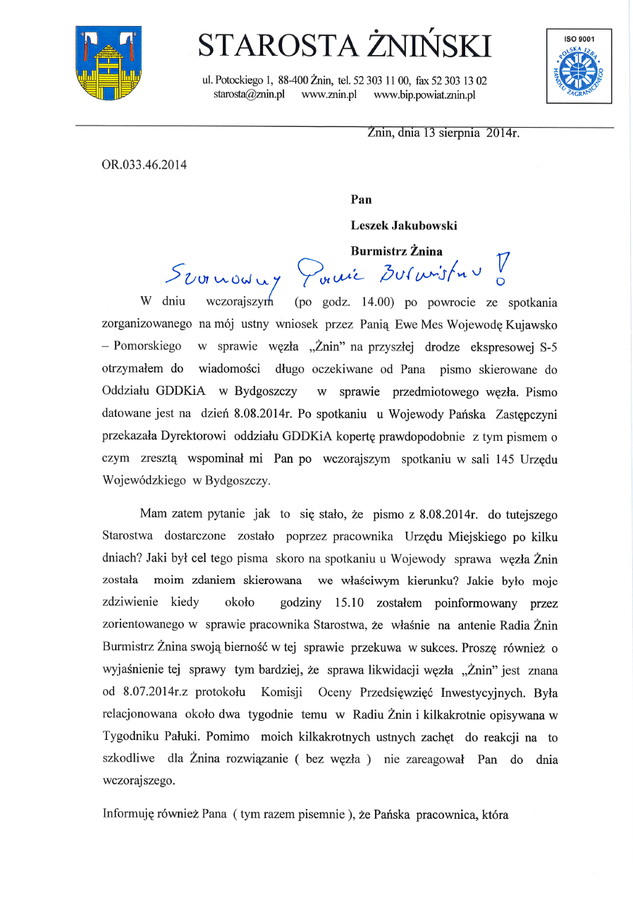 Poniżej prezentujemy pismo storosty żnińskiego Zbigniewa Jaszczuka do burmistrza Żnina Leszka Jakubowskiego.