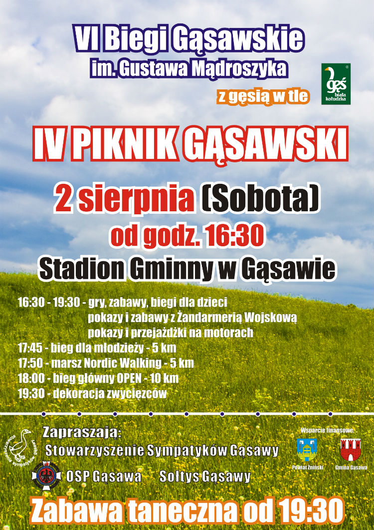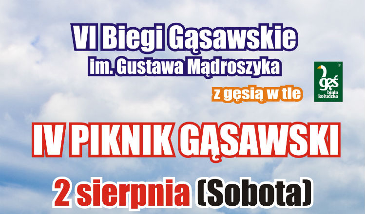 Stowarzyszenie Sympatyków Gąsawy, sołtys Gąsawy i Ochotnicza Straż Pożarna w Gąsawie zapraszają na VI Biegi Gąsawskie im. Gustawa Mądroszyka oraz IV Piknik Gąsawski. Udział w biegach zadeklarowało już około 200 zawodników z całego kraju.